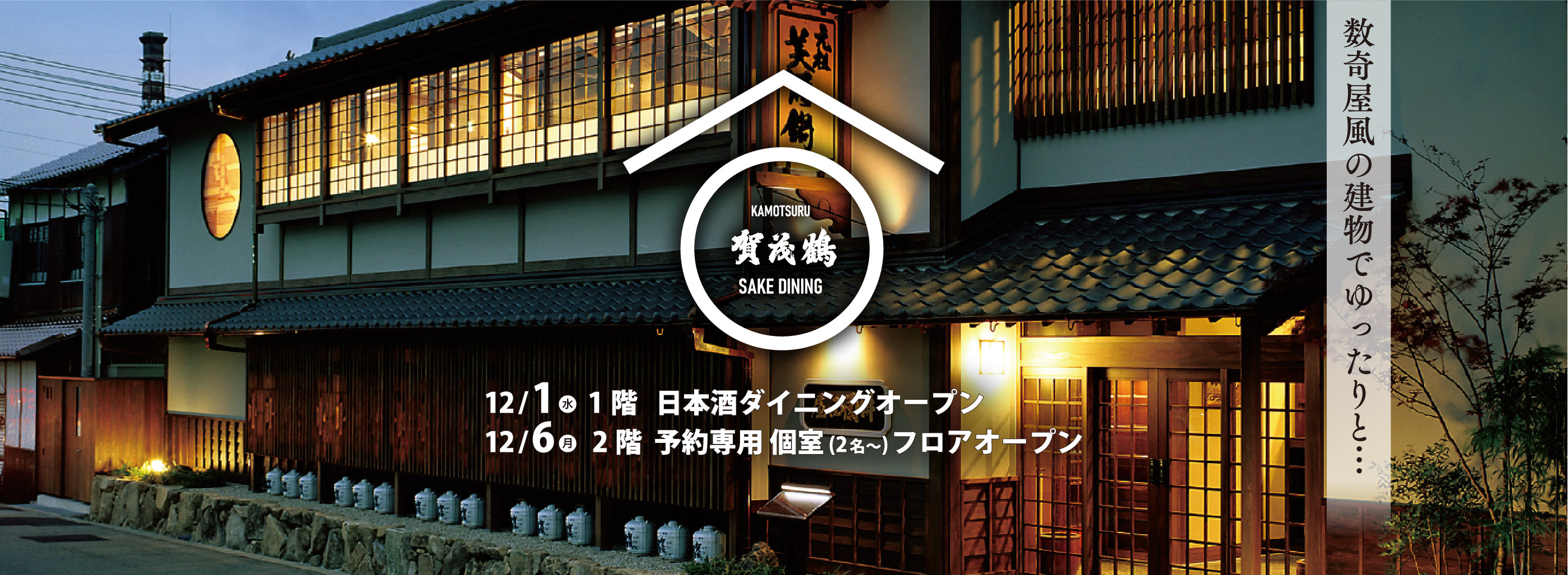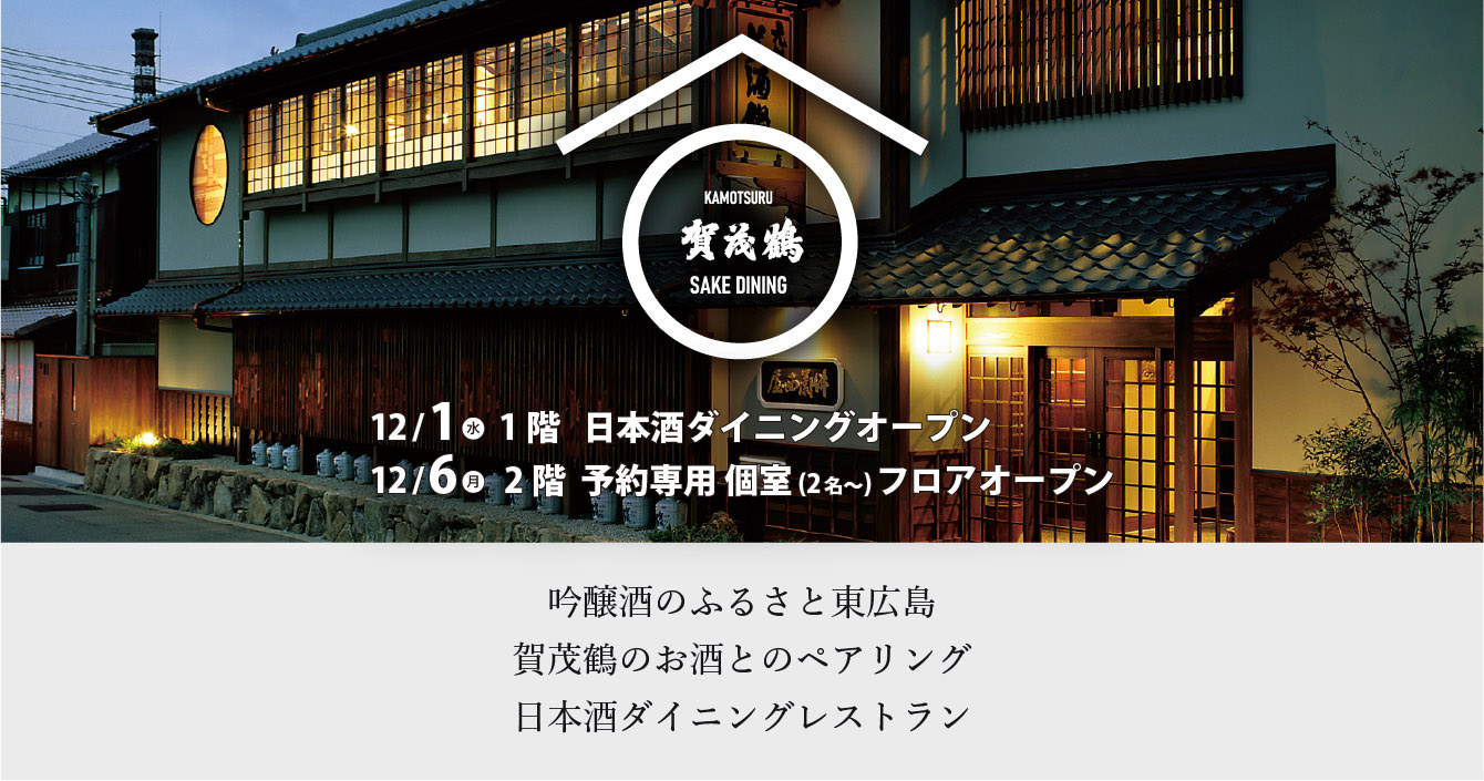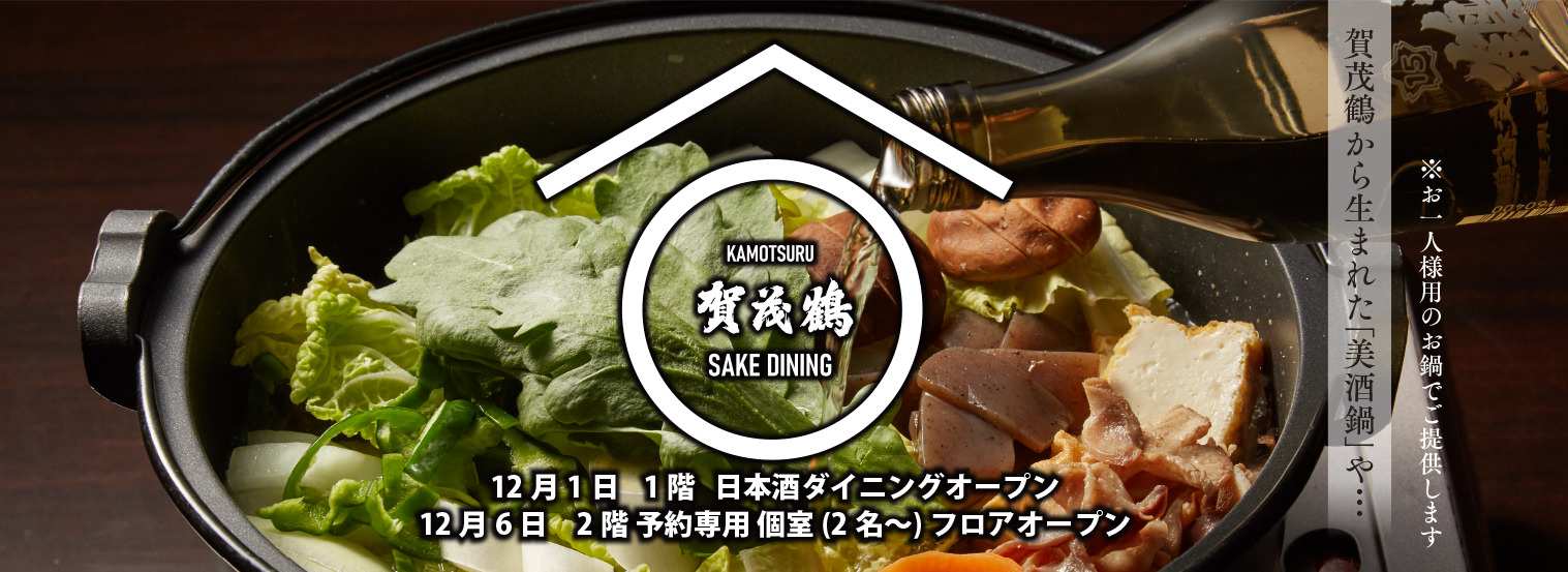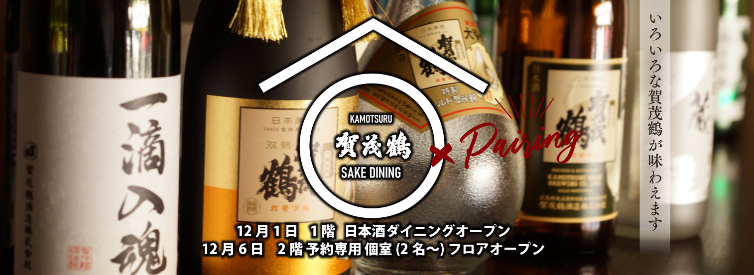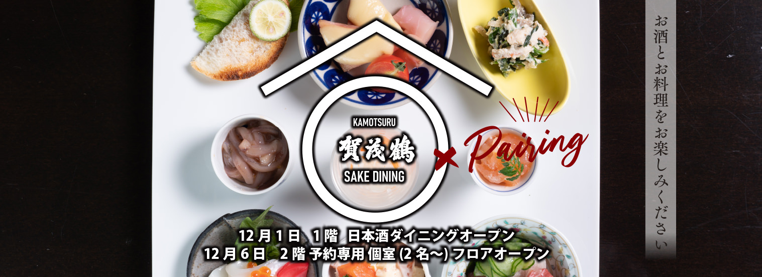 1階のダイニングでは賀茂鶴の多彩な日本酒ラインナップを和洋の料理でカジュアルにお楽しみください