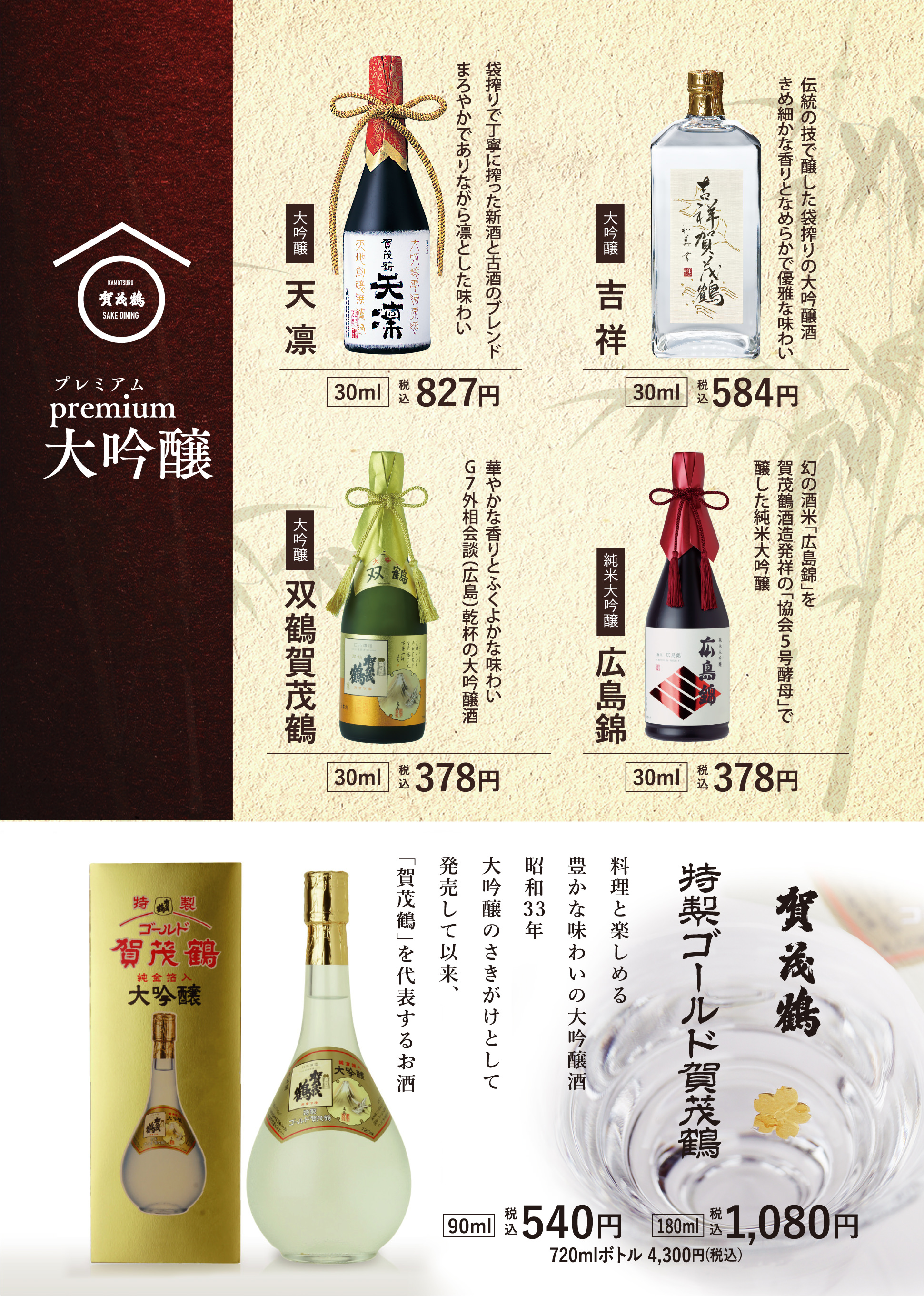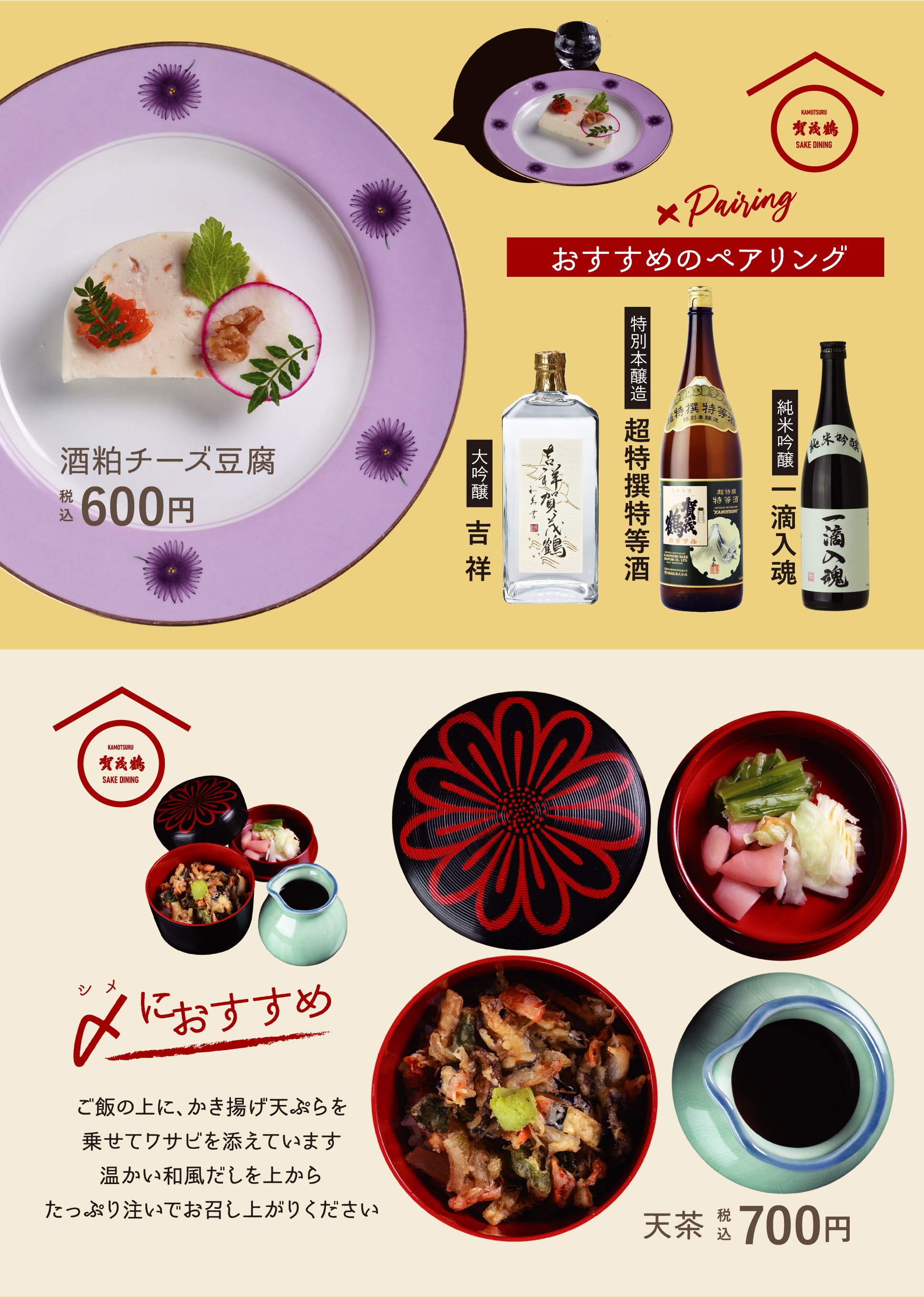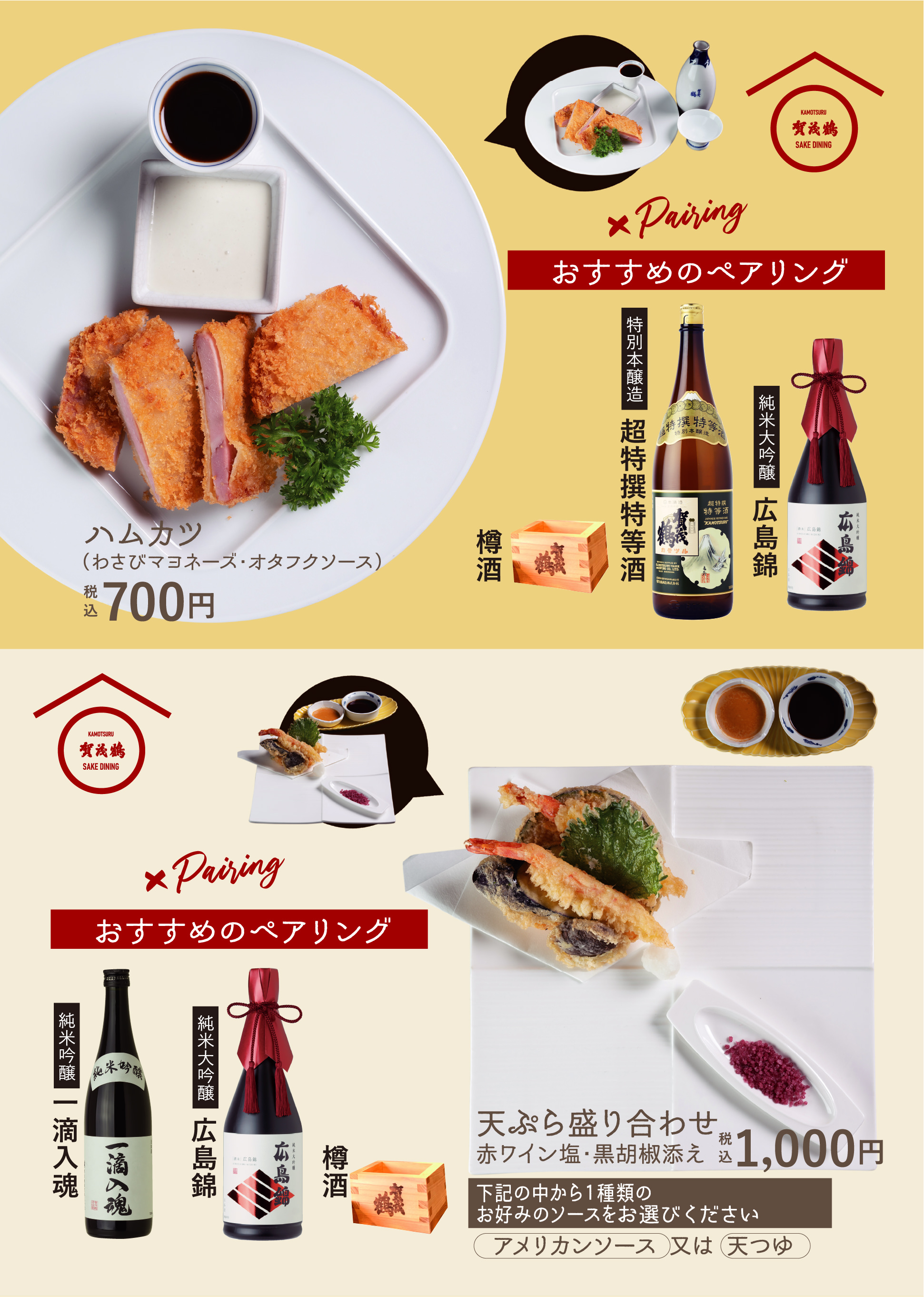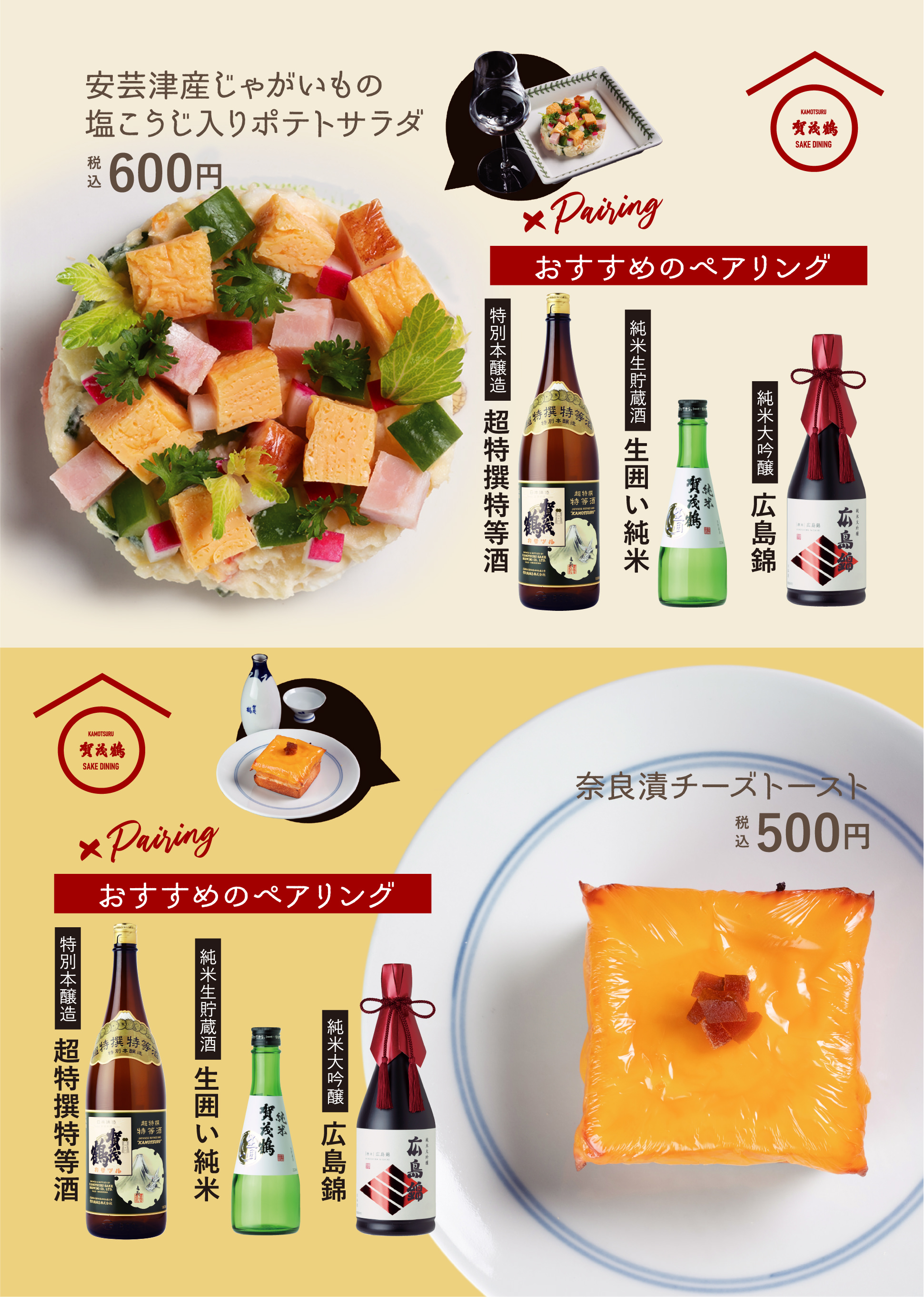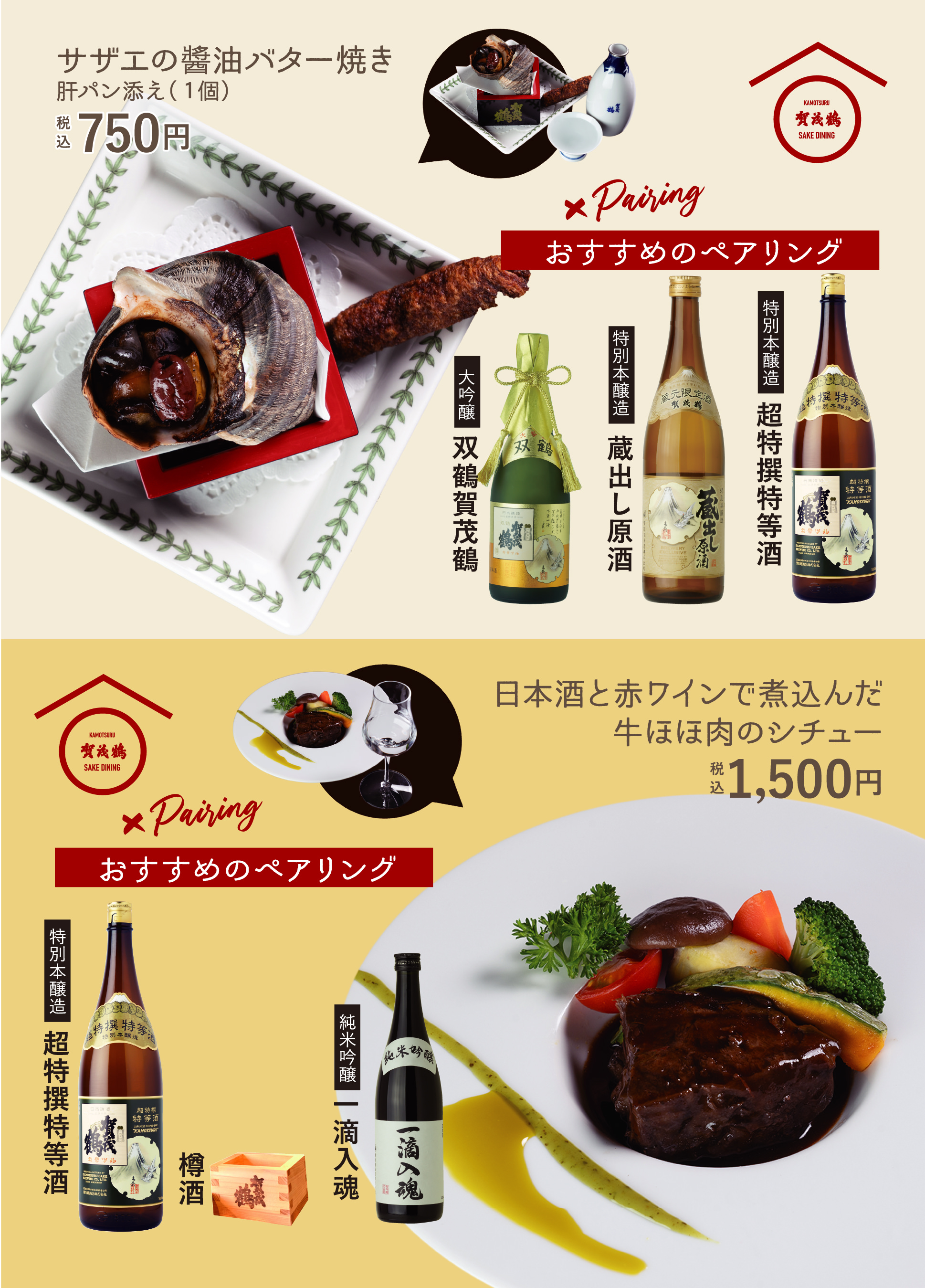 1階のダイニングでは賀茂鶴の多彩な日本酒ラインナップを和洋の料理でカジュアルにお楽しみください
