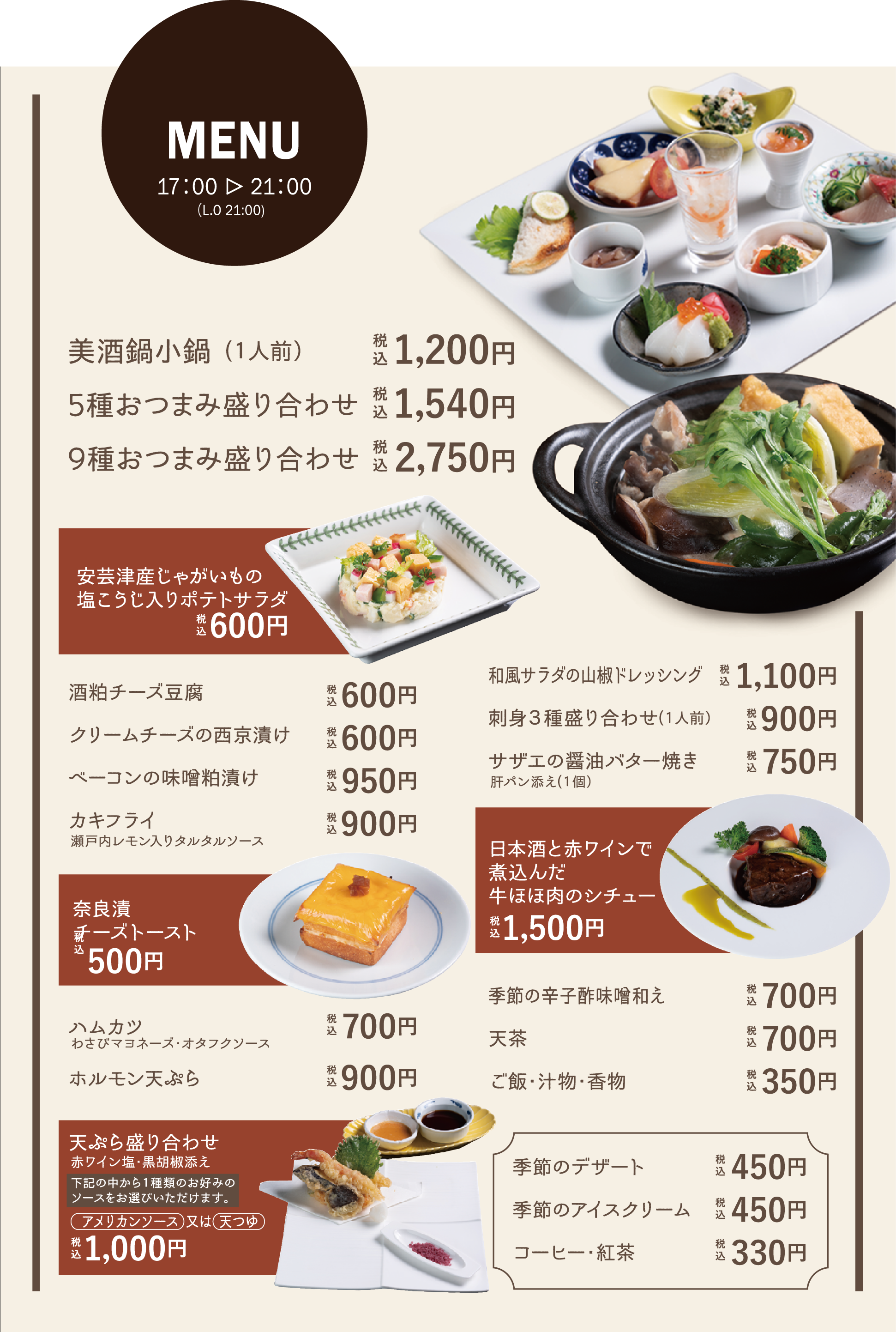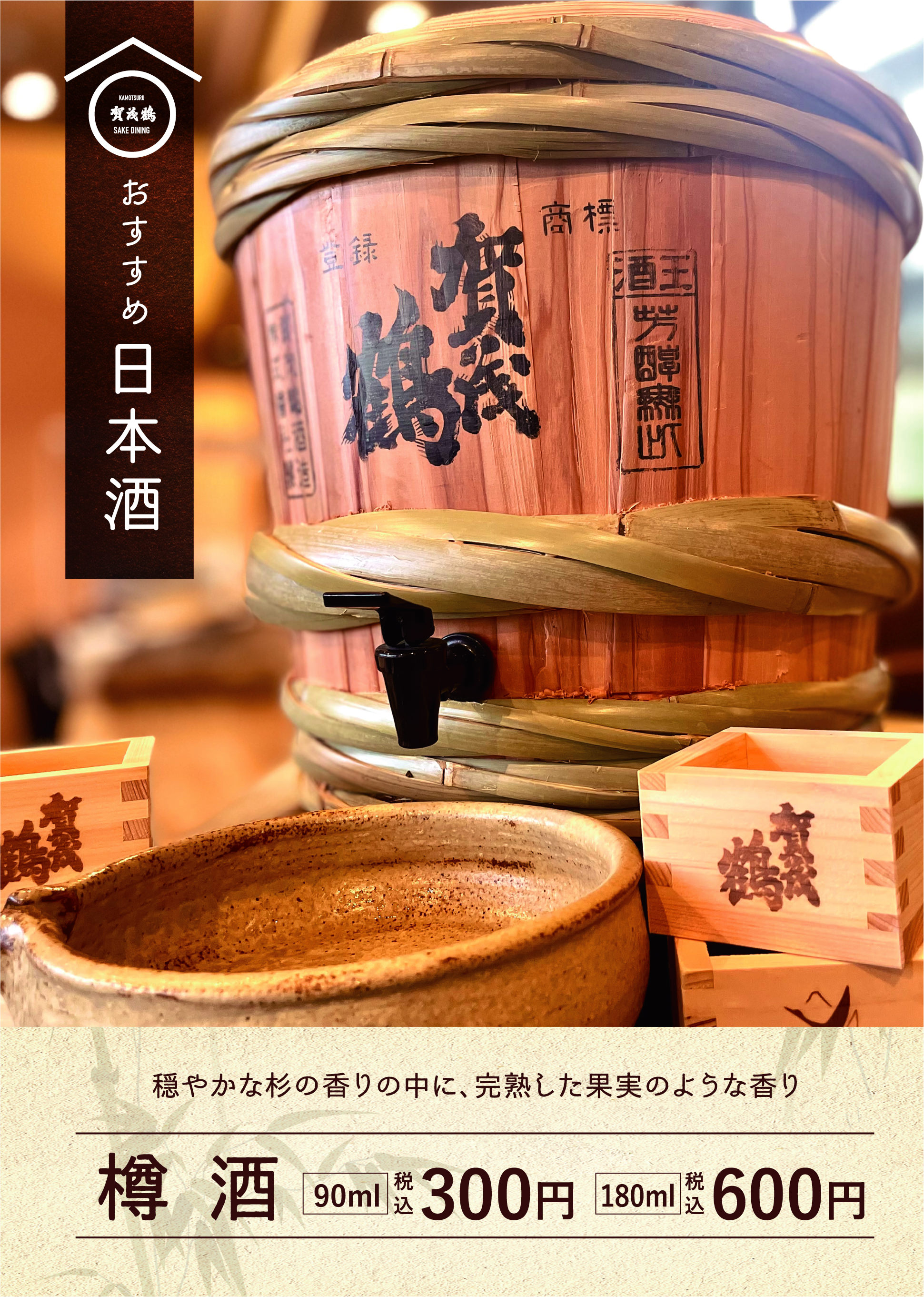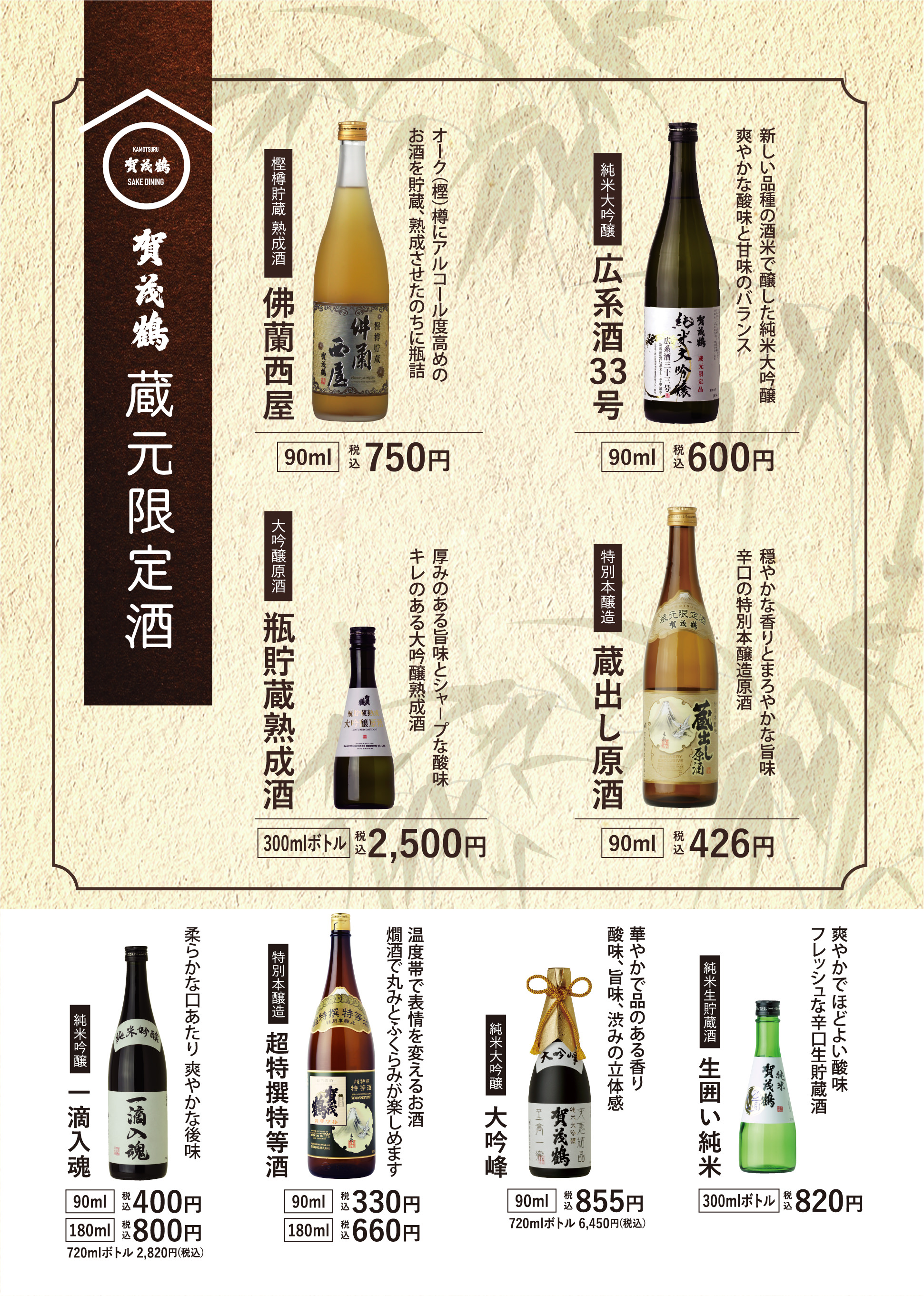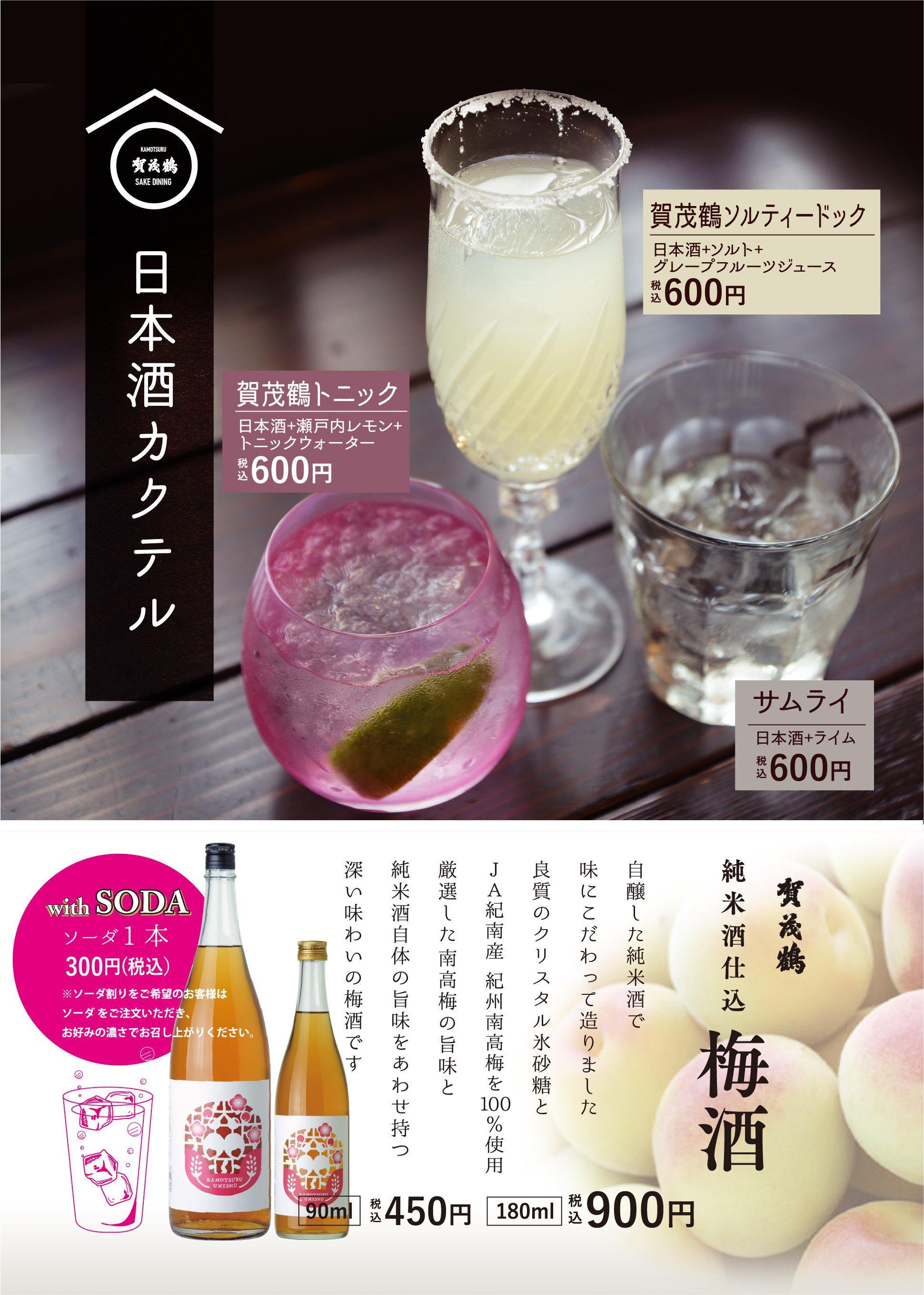 1階のダイニングでは賀茂鶴の多彩な日本酒ラインナップを和洋の料理でカジュアルにお楽しみください